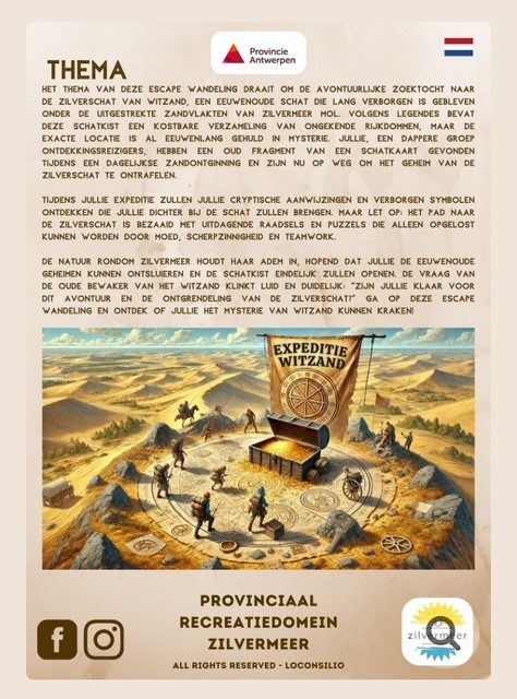 Het thema van deze Escape Wandeling draait om de avontuurlijke zoektocht naar de Zilverschat van Witzand, een eeuwenoude schat die lang verborgen is gebleven onder de uitgestrekte zandvlakten van Zilvermeer Mol. Volgens legendes bevat deze schatkist een kostbare verzameling van ongekende rijkdommen, maar de exacte locatie is al eeuwenlang gehuld in mysterie. Jullie, een dappere groep ontdekkingsreizigers, hebben een oud fragment van een schatkaart gevonden tijdens een dagelijkse zandontginning en zijn nu op weg om het geheim van de Zilverschat te ontrafelen.