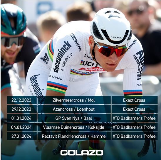 De Exact Cross Mol heeft de eer de veldrit te zijn waar Van der Poel zijn crossseizoen 2023-2024 zal beginnen. Ook in de daaropvolgende Exact Cross, de Azencross in Loenhout, tekent Mathieu present. Dat is ook het geval in drie X20 Badkamers Trofeecrossen in januari: op nieuwjaarsdag in Baal, op 4 januari in Koksijde en op de Rectavit Flandriencross in Hamme op 27 januari, één week voor het WK in Tabor waar Mathieu zijn regenboogtrui zal verdedigen.