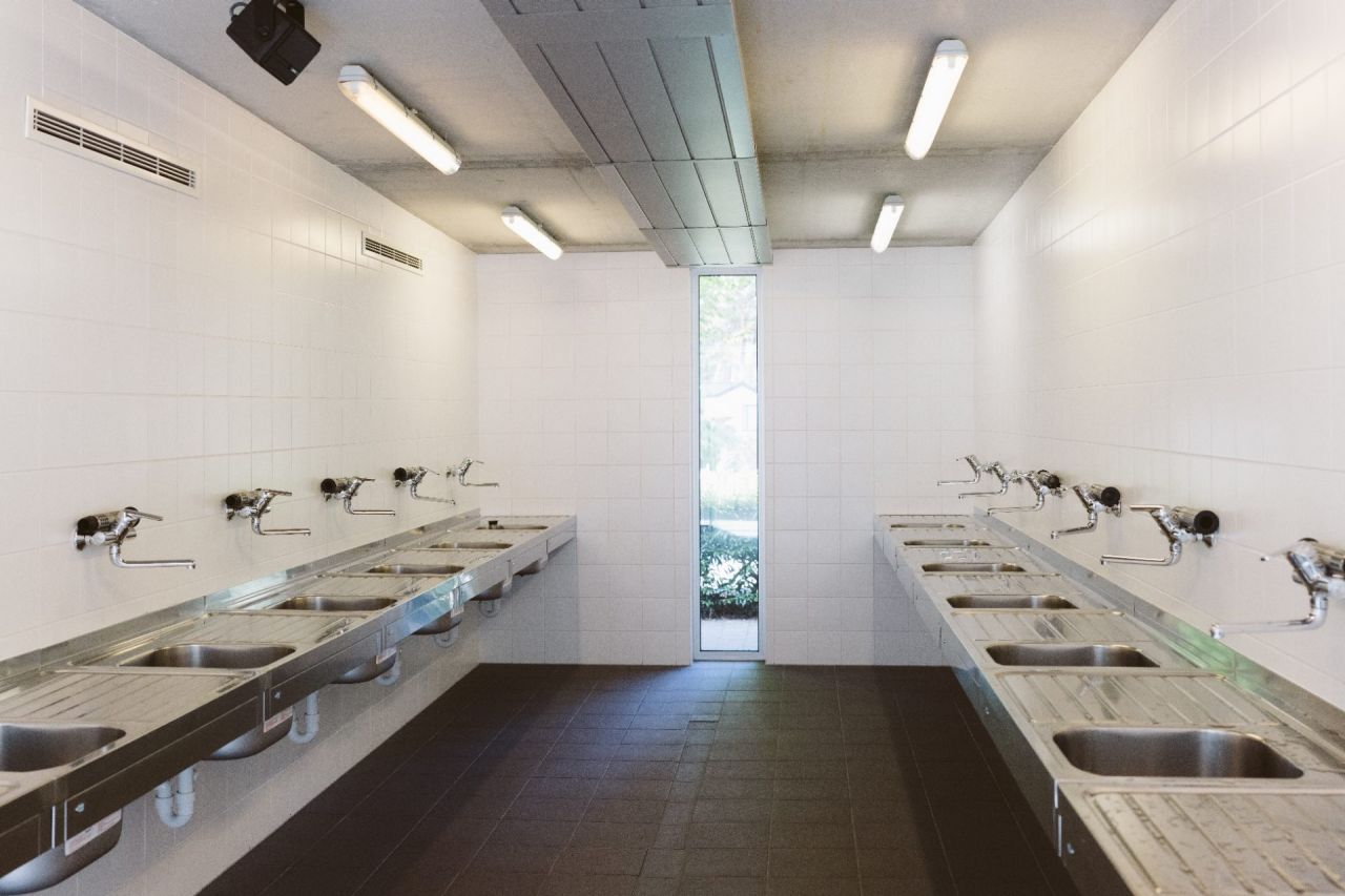 - De meeste sanitaire gebouwen hebben een schuifdeur; aangepaste toiletten, lavabo’s en douches.